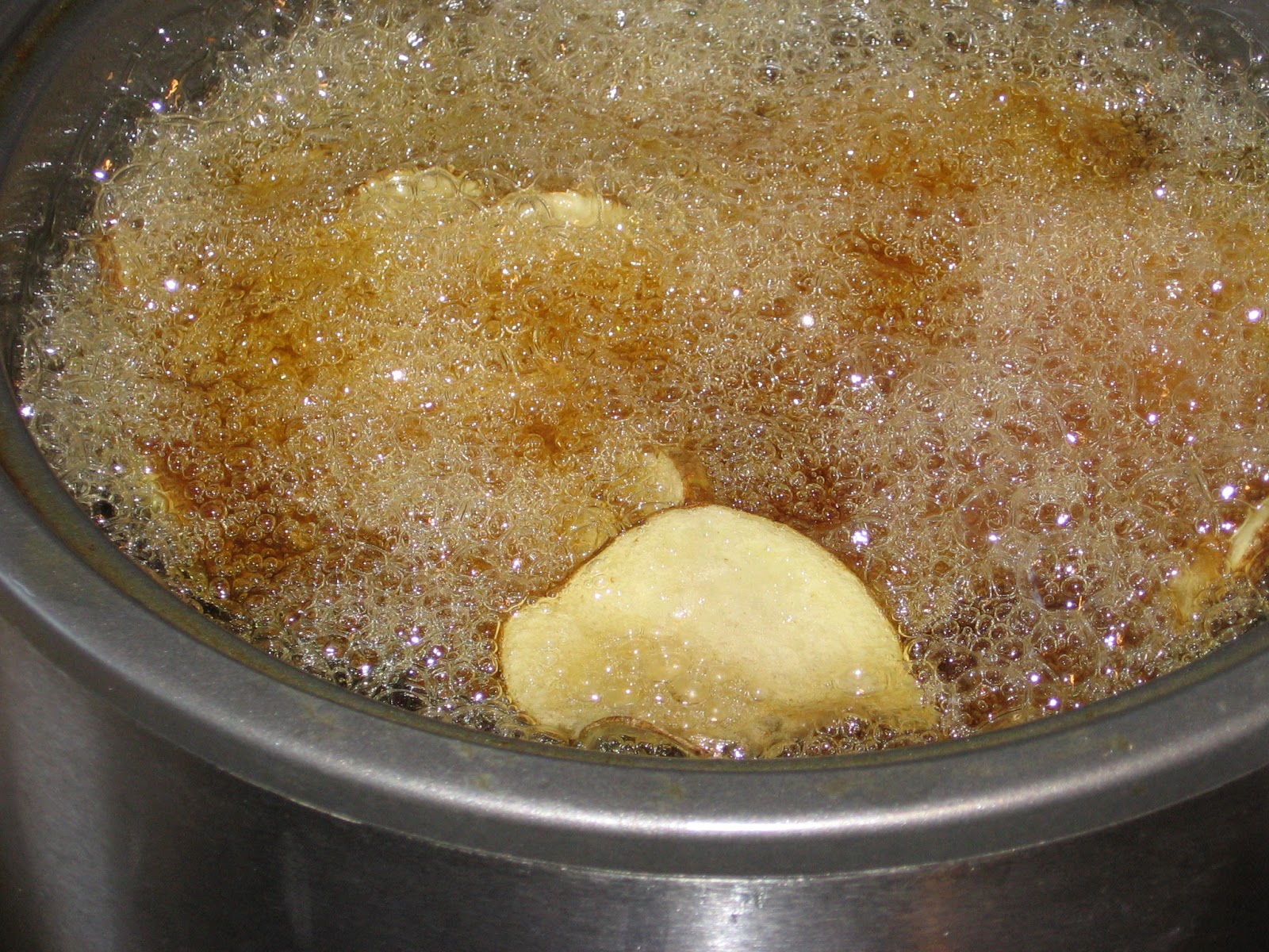Also likely to take about 10 minutes. Because you are human, the slices will be of varying thickness. After about 10 minutes, some will be completely crisp like potato chips, and the thicker ones will be cooked and browned, but still have that soft potato goodness. This is a good thing. Once they're out of the fryer, drain the chips on paper towels and salt. Throw in the vegetable of your choice, some ketchup, and bon apetit:
